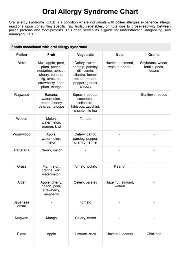 Discover more about Oral Allergy Syndrome (OAS) with Carepatron comprehensive chart, outlining common triggers, symptoms, and management options.