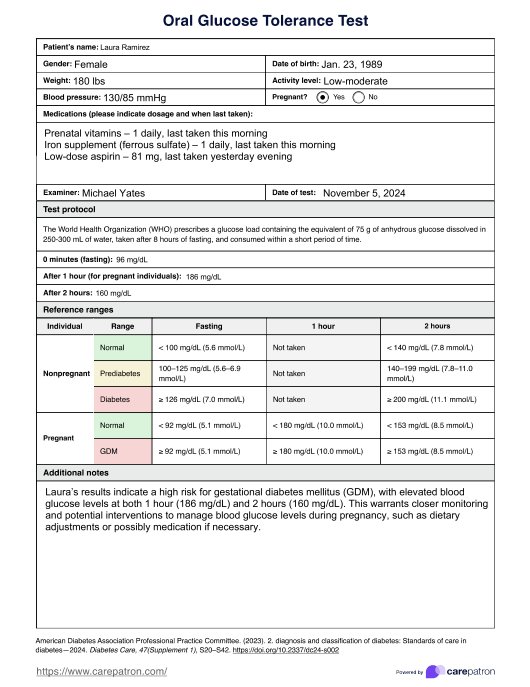 Reading Oral Glucose Tolerance Test (OGTT) results involves comparing measured blood glucose levels at fasting, 1-hour, and 2-hour post-glucose intake against standardized thresholds. Elevated plasma glucose values can indicate abnormal glucose tolerance, prediabetes, or diabetes. The actual OGTT test report format may vary depending on the laboratory's preferred report format.