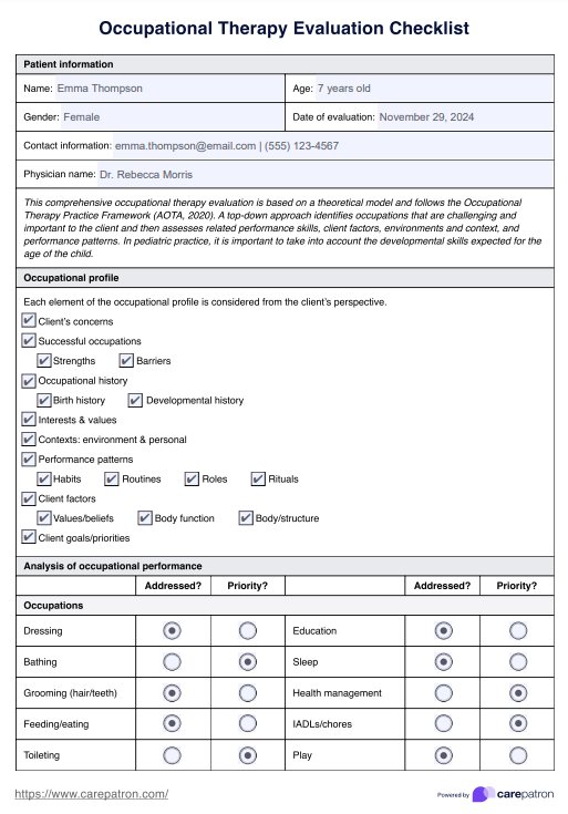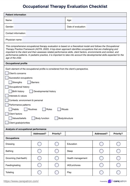 Download Carepatron's free PDF of an Occupational Therapy Evaluation Checklist. Learn how it helps assess and document progress effectively for OT patients.