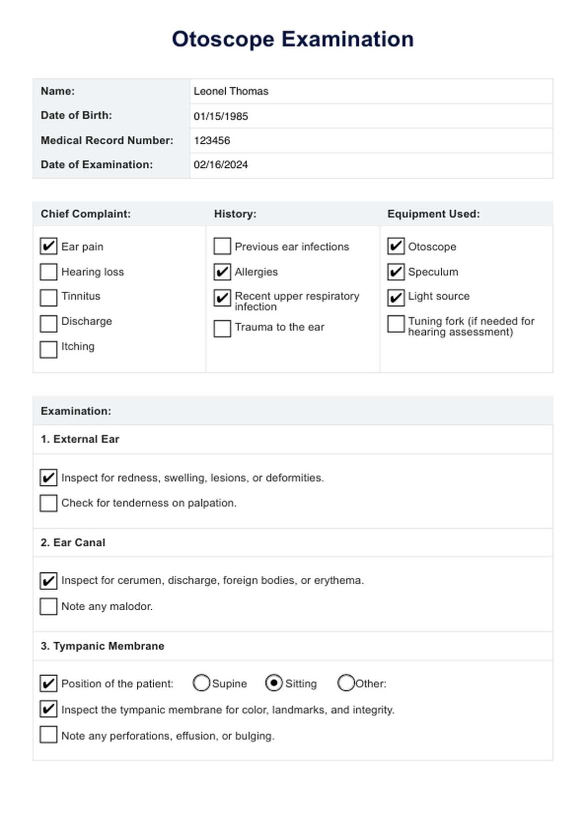 Learn how to perform an otoscope examination and see an example with our Carepatron's free PDF download.