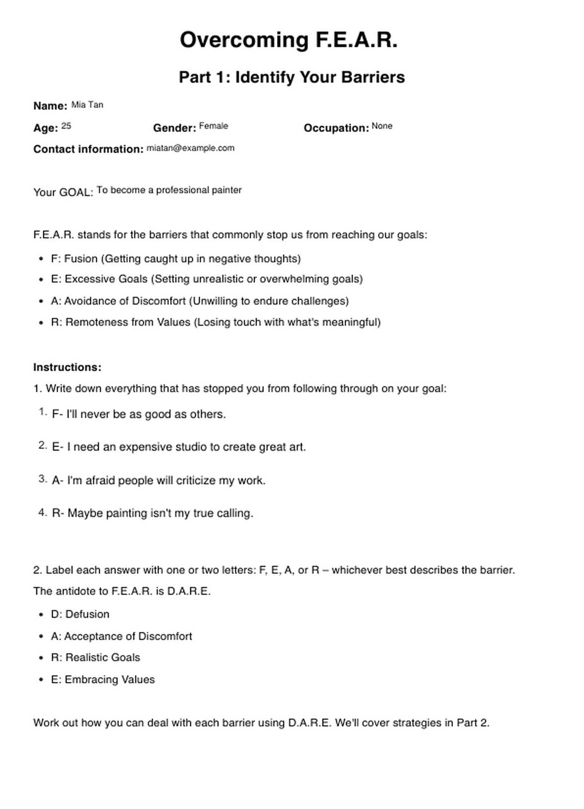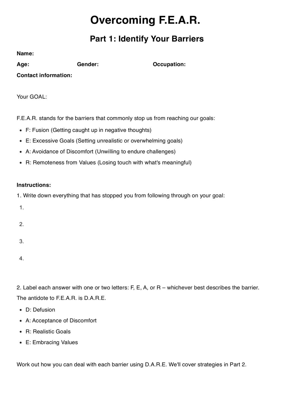 Overcoming FEAR ACT Worksheet Template