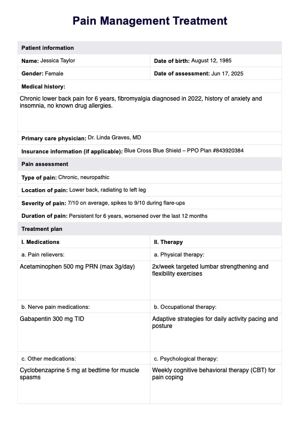 Discover effective pain management treatments and examples through Carepatron's free PDF download. Learn about various strategies to alleviate pain and improve your quality of life.