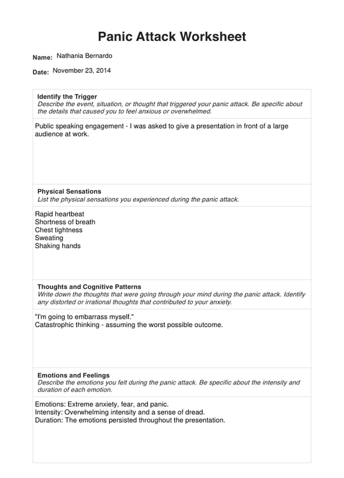 Using a Panic Attack Worksheet can help people better understand and manage their panic attacks. The worksheet can be an effective tool in managing anxiety symptoms by providing a structured format to identify triggers, practice coping strategies, and document progress over time.