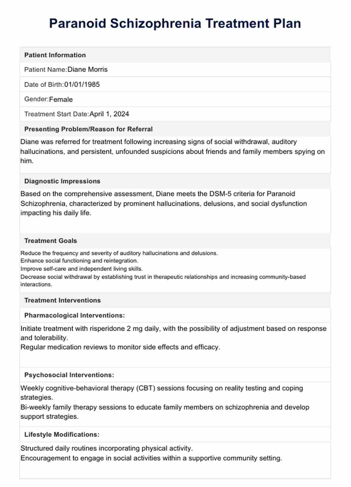 Explore a comprehensive treatment plan template for paranoid schizophrenia to monitor progress and improve client outcomes.