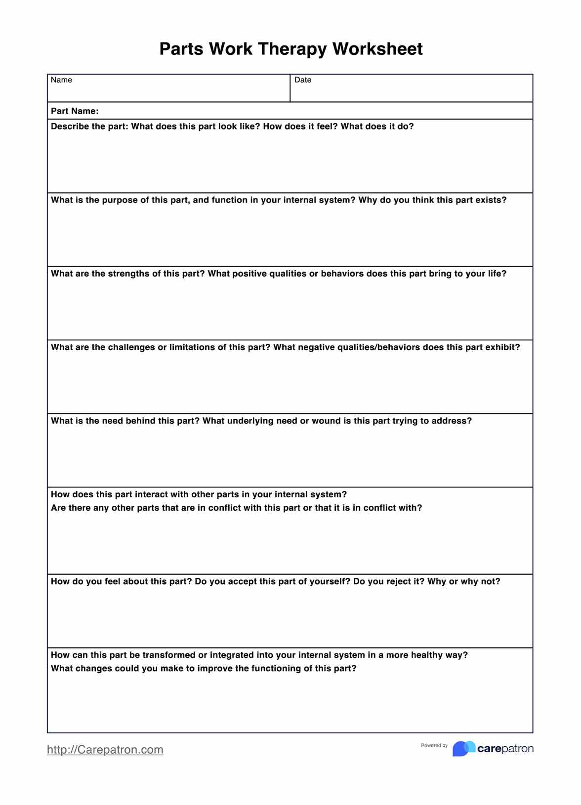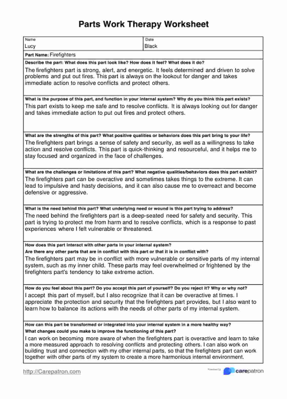 The worksheet guides individuals through identifying and exploring different parts of their psyche. This may involve reflecting on emotions, behaviors, and beliefs and understanding the motivations and needs of each part. The worksheet can help individuals resolve inner conflict, improve emotional regulation, and promote self-compassion and personal growth.