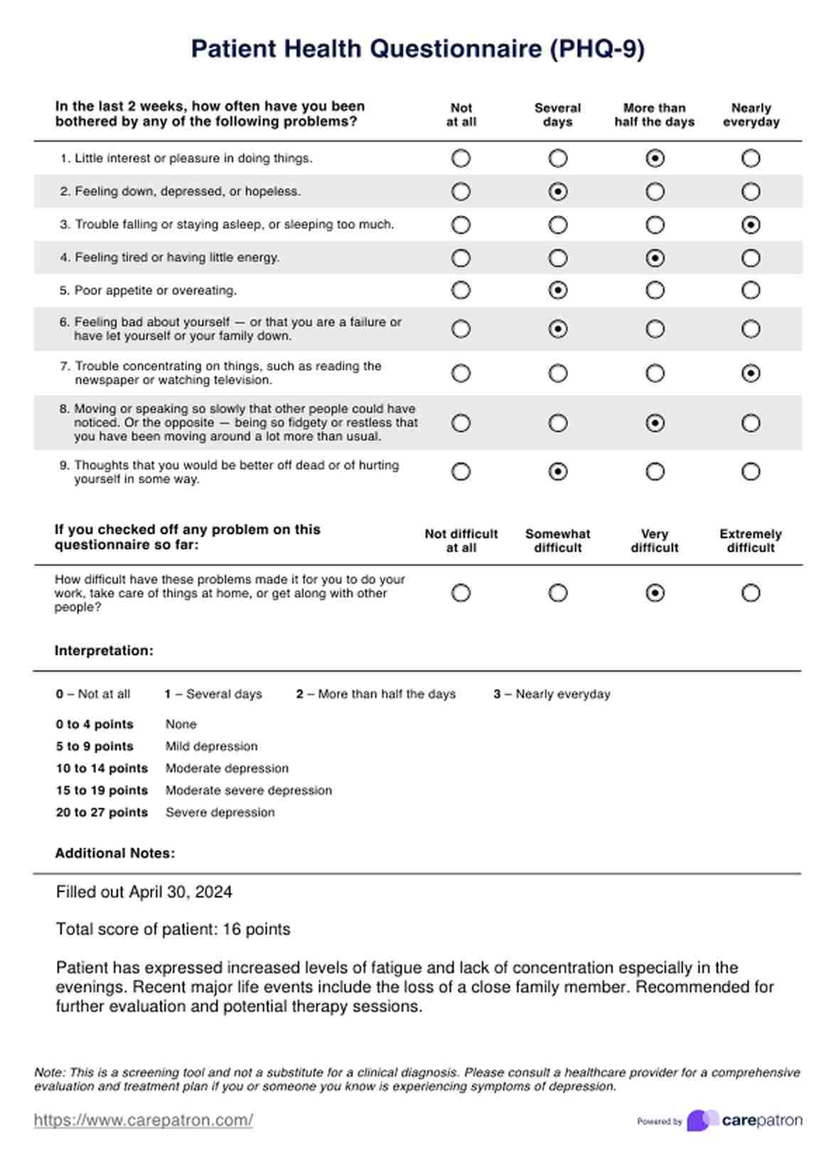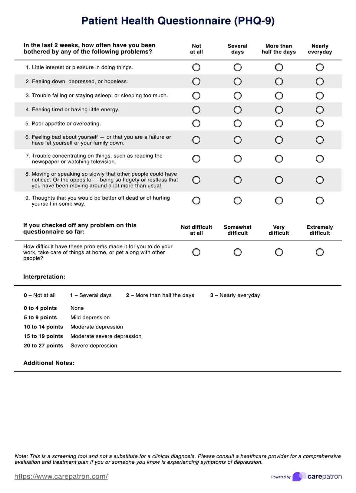 Patient Health Questionnaire (PHQ-9) Template