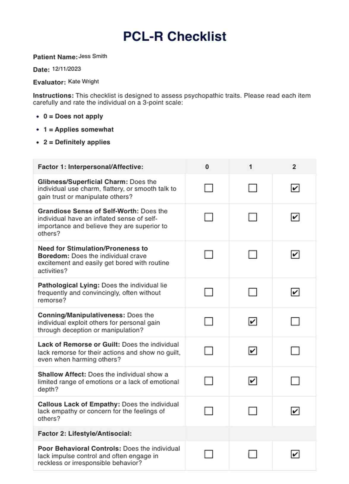 Carepatron has a ready-to-download and use PCL-R Checklist report template for your convenience.