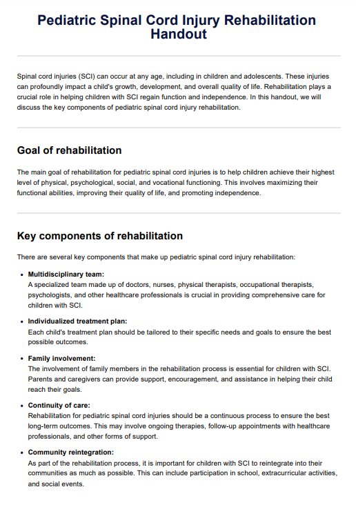 Download Carepatron's free PDF handout on pediatric spinal cord injury rehabilitation featuring valuable information for your patients.