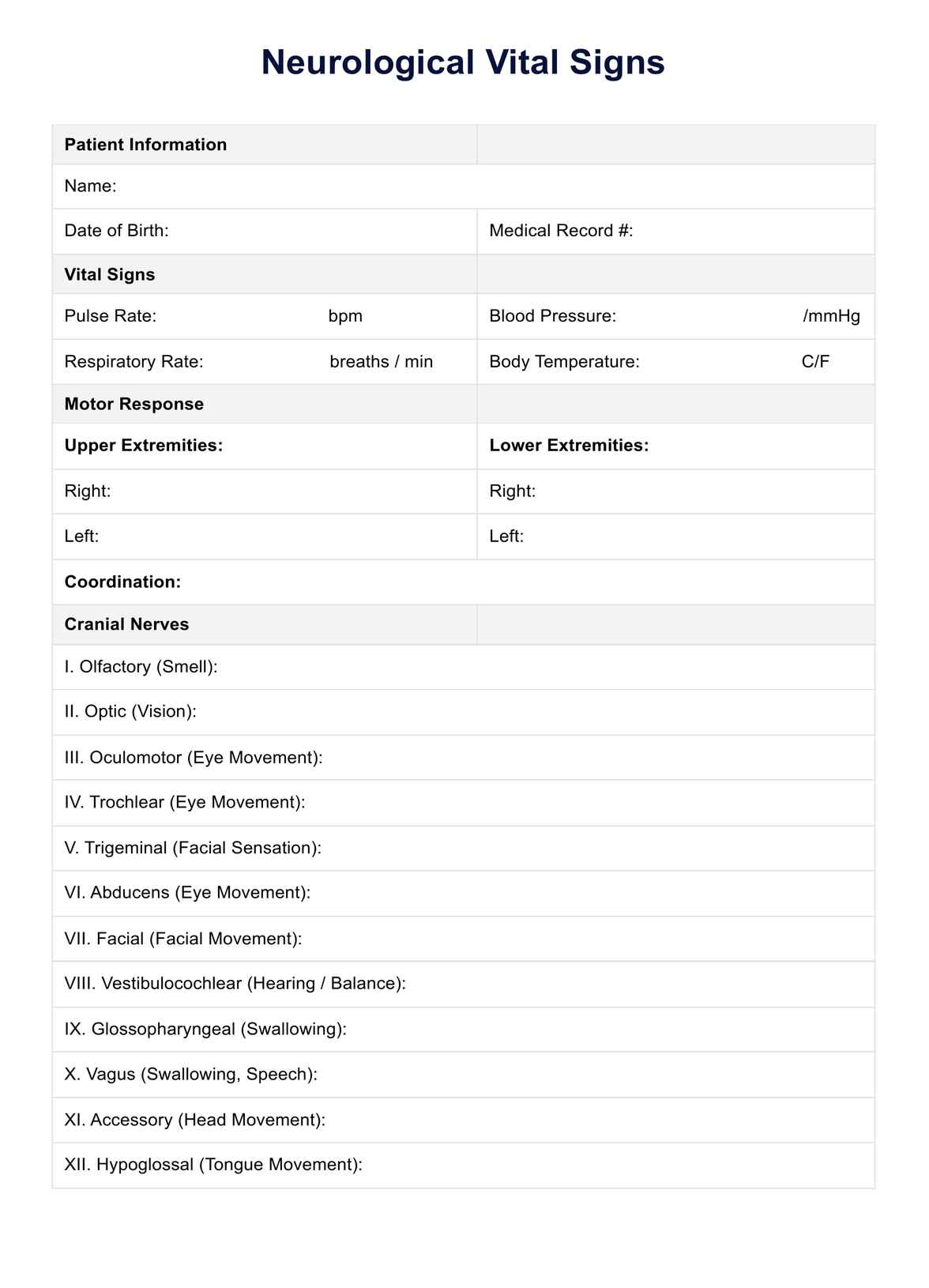 The Pediatric Vital Signs Chart is designed to record and interpret a child’s key health parameters, including heart rate (awake and asleep), respiratory rate, blood pressure (systolic and diastolic), body temperature, and oxygen saturation (SpO2). It includes fields for results, age-specific reference ranges, and interpretations (low, normal, or high). This structured format ensures consistent and accurate documentation for comprehensive patient monitoring.