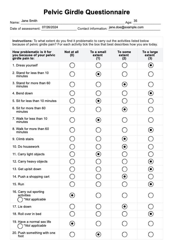 The Pelvic Girdle Questionnaire (PGQ) assesses the impact of pelvic girdle pain on an individual’s daily life and activities. It helps evaluate the severity of symptoms and activity limitations, aiding in both diagnosis and treatment planning.