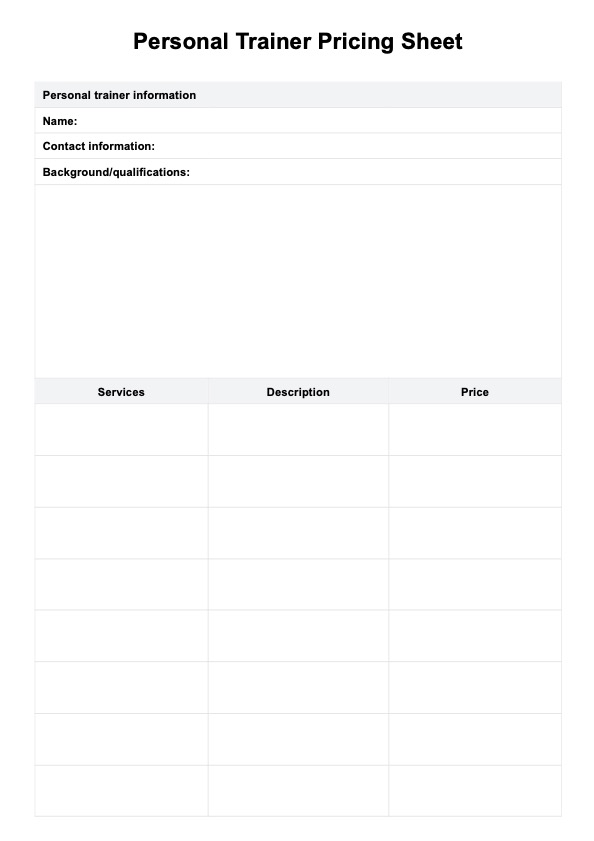 Set competitive rates for personal training sessions with our Personal Trainer Pricing Sheet. Elevate your fitness business with transparent pricing.