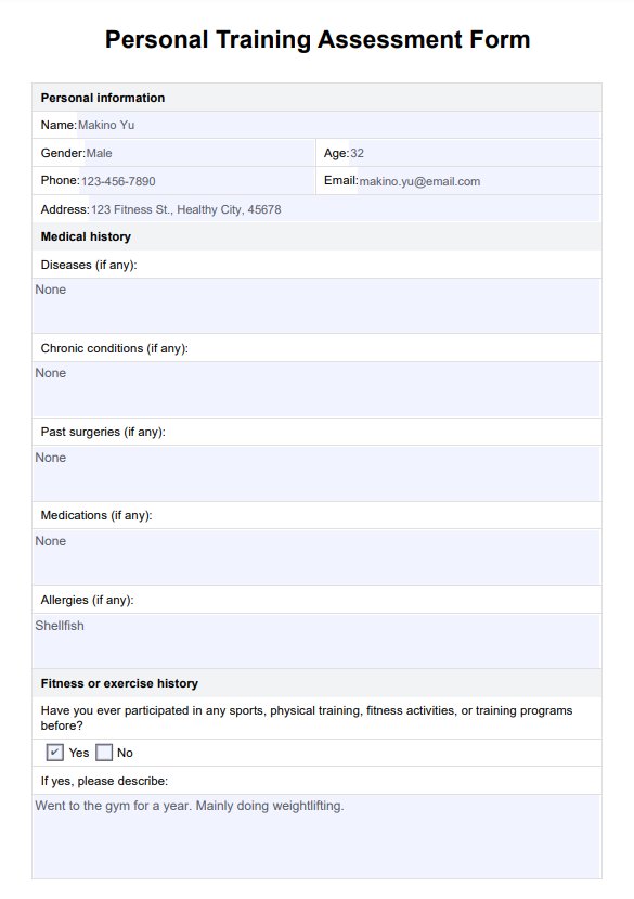 Explore the Personal Training Assessment Form, an essential tool for trainers to evaluate fitness levels and customize workouts. Download a free PDF today.