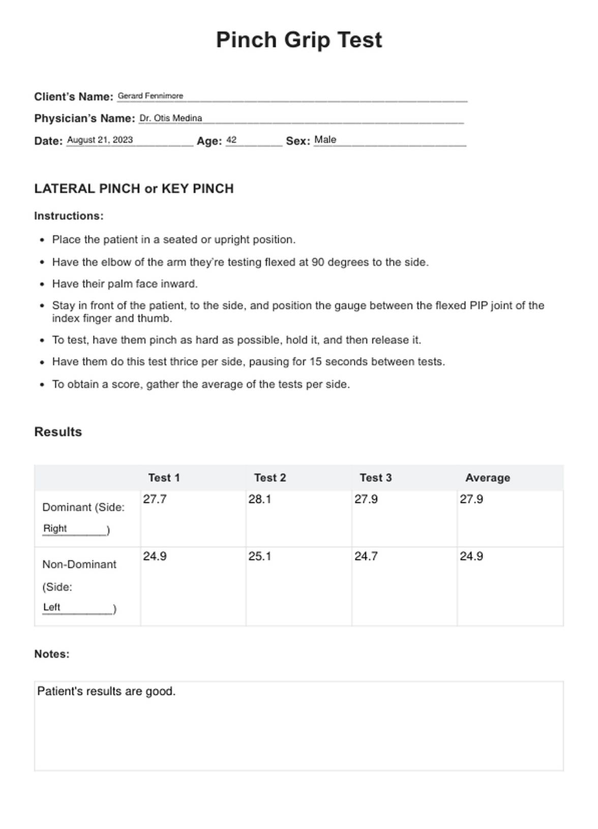 A pinch grip test template is usually used when a company requests proof that employees can use their hands extensively for work if they are prone to developing repetitive motion disorders, etc.