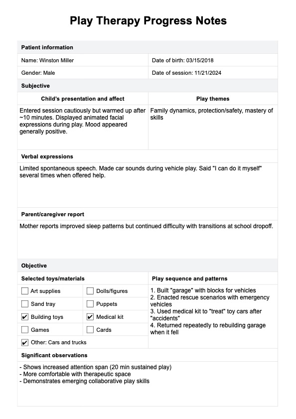 To write a play therapy session note, begin by documenting basic information, such as the session's date, time, and duration. Describe the activities engaged in during the session, noting the child's behavior, emotional responses, and any significant interactions or themes that emerged. Highlight any progress towards therapeutic goals and any concerns that need to be addressed in future sessions. Finally, summarize your observations and reflections on the session, ensuring confidentiality and professionalism.