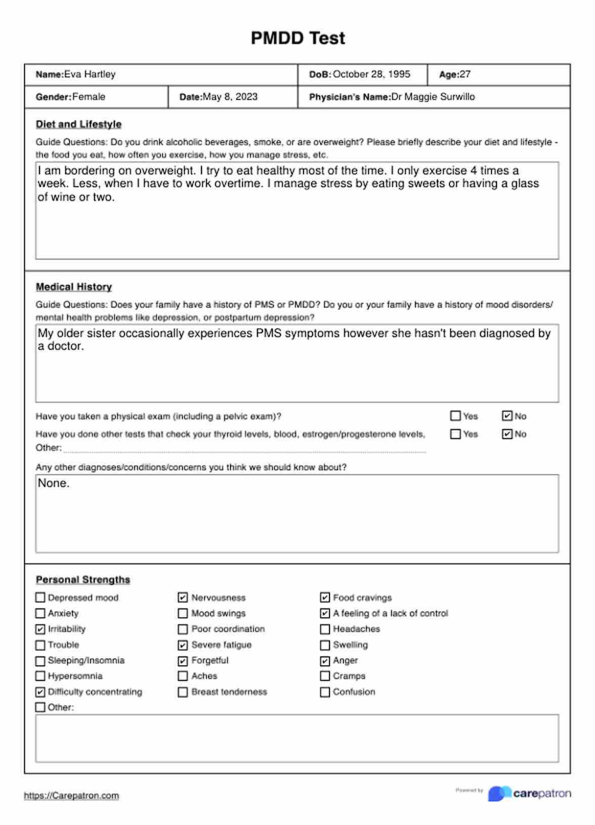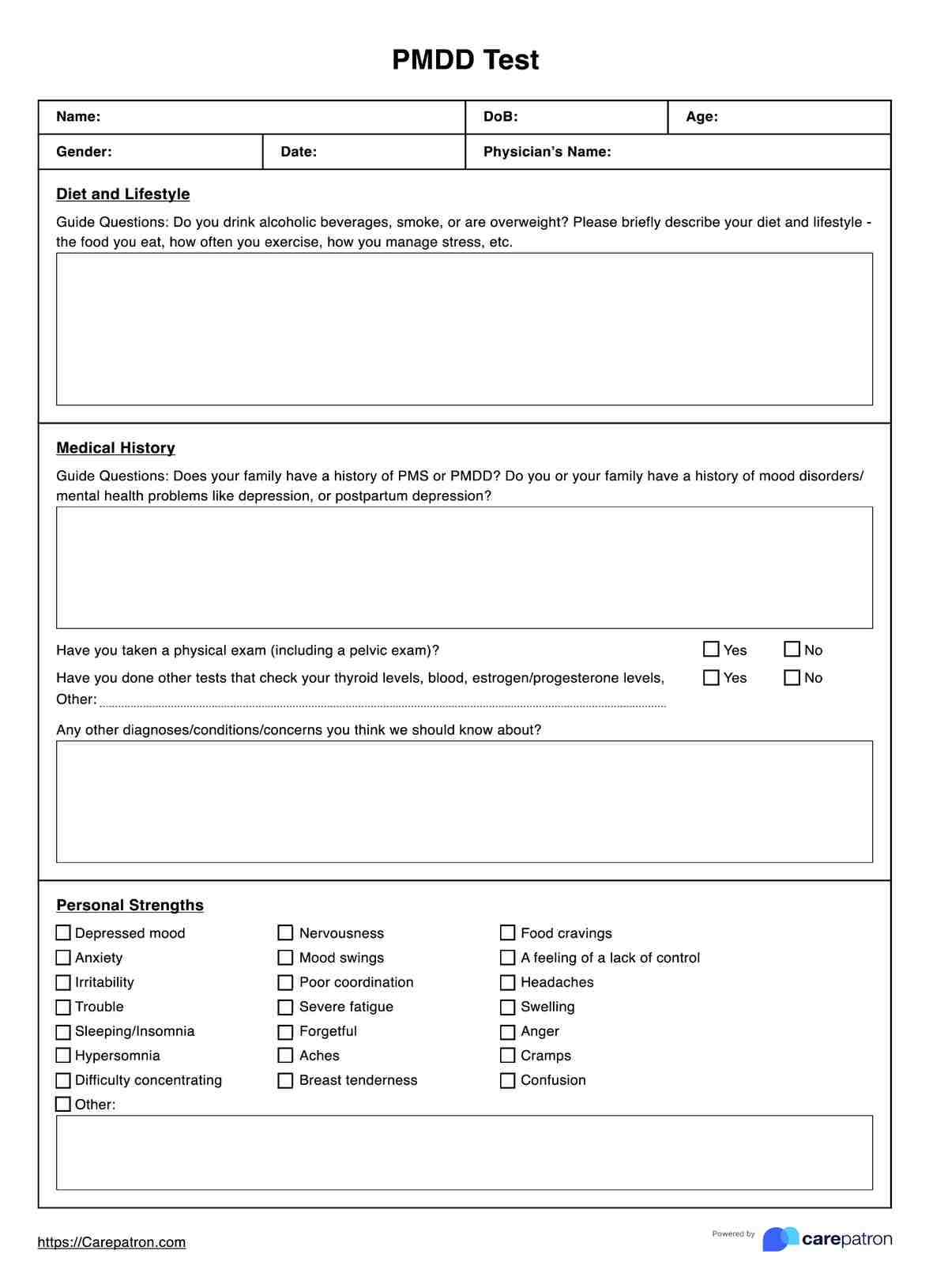 Utilize and download this PMDD test to track your patient’s symptoms and their severity to determine if they have a premenstrual dysphoric disorder.