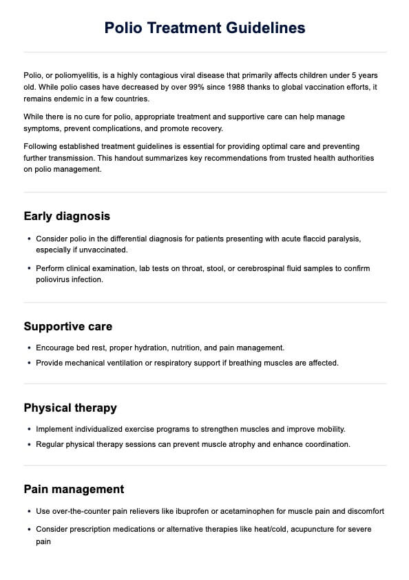 Learn about polio and how to manage this condition. Download a free Polio Treatment Guidelines handout from Carepatron.