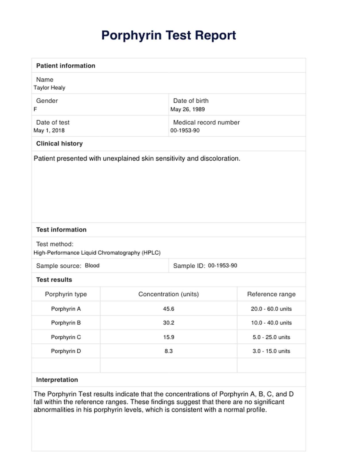 Download a free Porphyrin Test Report template. Record patient information and results seamlessly with this printable PDF template.