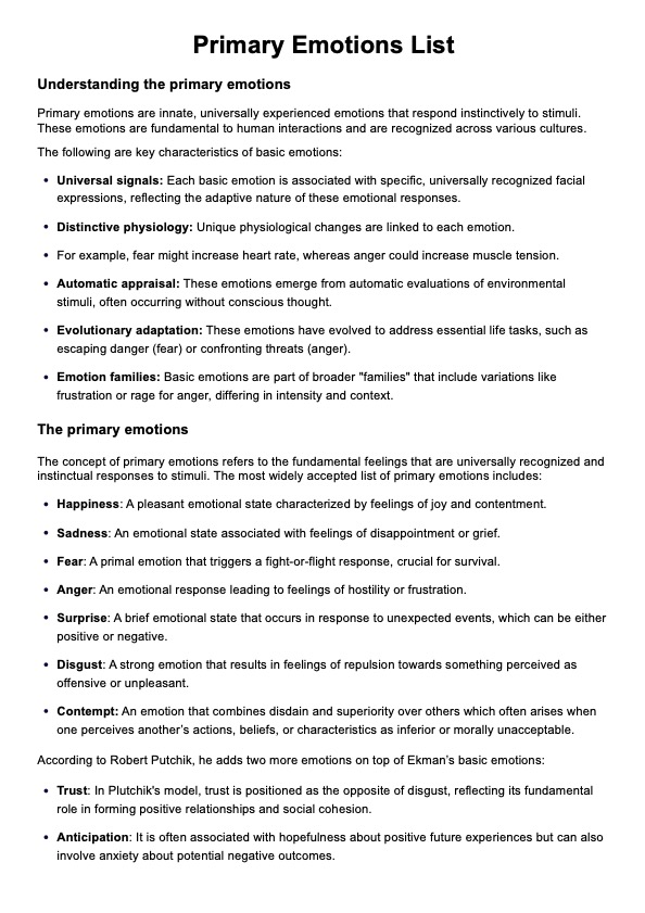 Explore and download Carepatron's free Primary Emotions List PDF here. Understand the different emotions and how they manifest in our daily lives.