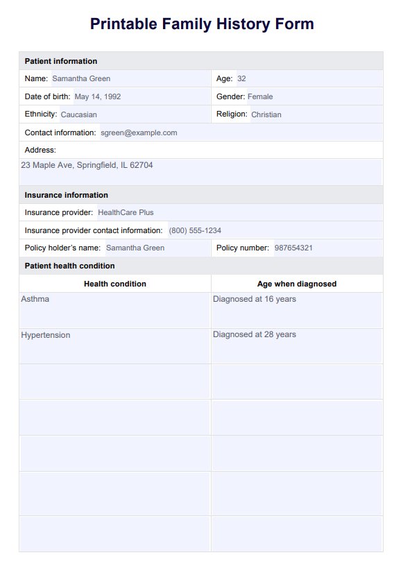 A family history form is a document that records the health information of an individual and their biological relatives, including diseases and conditions affecting family members, both living and deceased. This form helps identify potential genetic risks and patterns of inheritance, often represented in a pedigree chart.