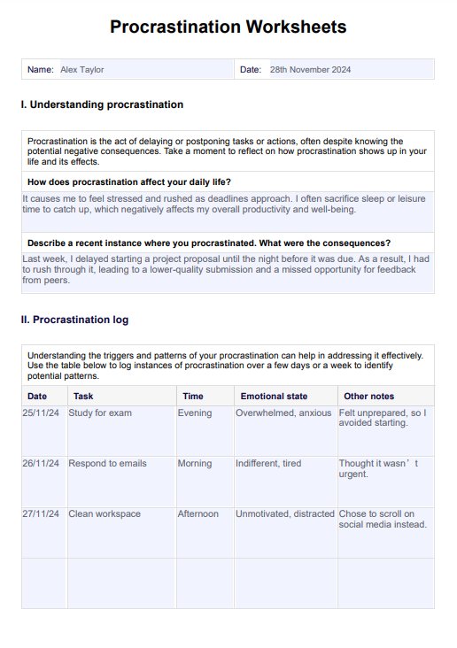 Chronic procrastination can result in heightened stress levels, contributing to physical health issues like headaches, fatigue, or weakened immunity. Procrastination Worksheets help mitigate these risks by promoting better self-regulation and time management. Through guided exercises and focusing on task prioritization, individuals can reduce stress and regain control over their responsibilities, improving mental and physical well-being.