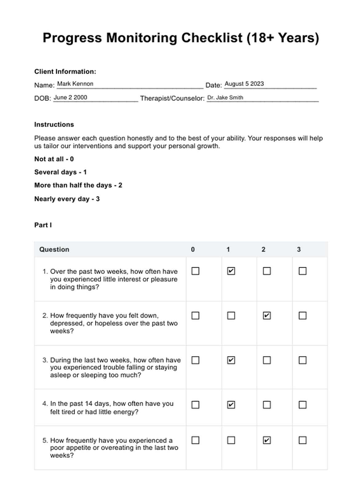 Interpreting the Progress Monitoring Checklist (18+ Years) findings entails thoroughly analyzing the scores and responses, providing valuable insights into the individual's progress and growth over time.