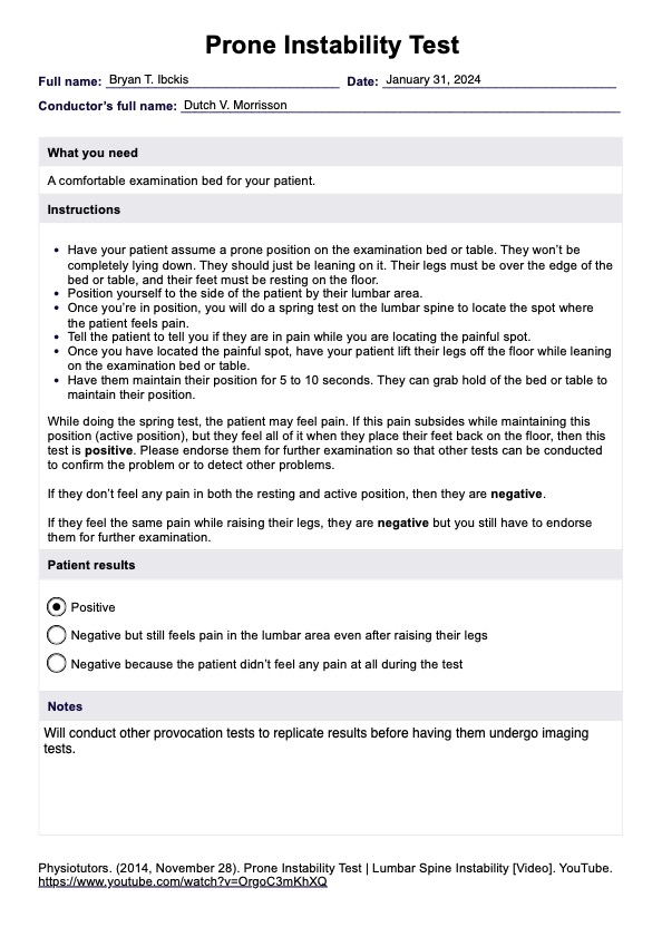 The Prone Instability Test is a physical examination technique. The instructions are simple, and it can be accomplished in 1 to 5 minutes.