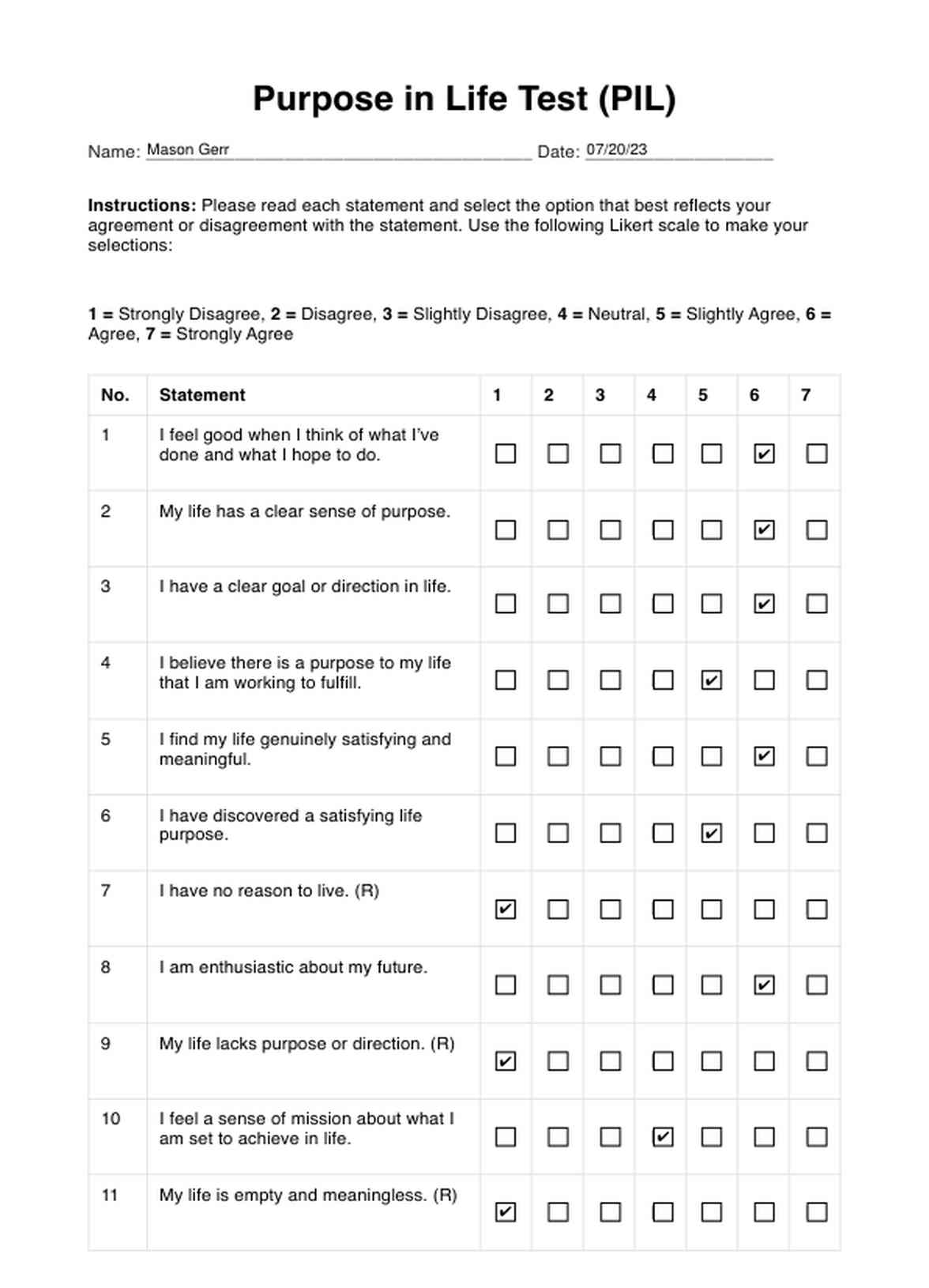 The test consists of a series of statements that you rate according to your level of agreement or disagreement. After completing the test, the scores are added up to indicate your sense of purpose in life.