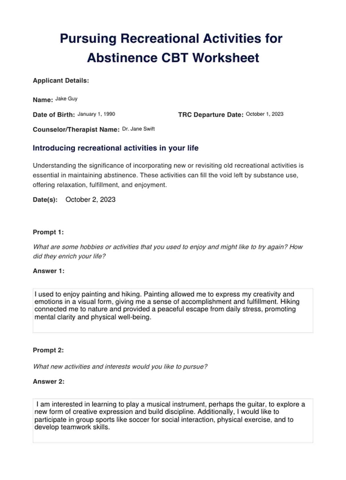 Pursuing Recreational Activities for Abstinence CBT Worksheet Template