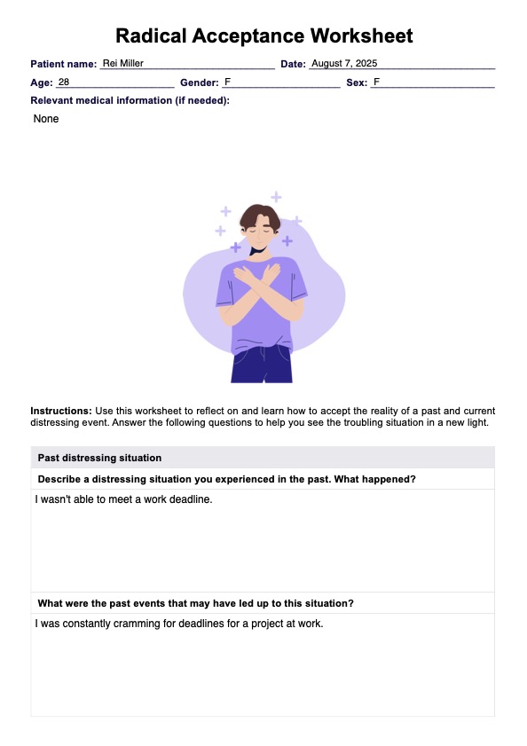 Teach your patient how to practice radical acceptance and manage difficult situations with a Radical Acceptance Worksheet template.