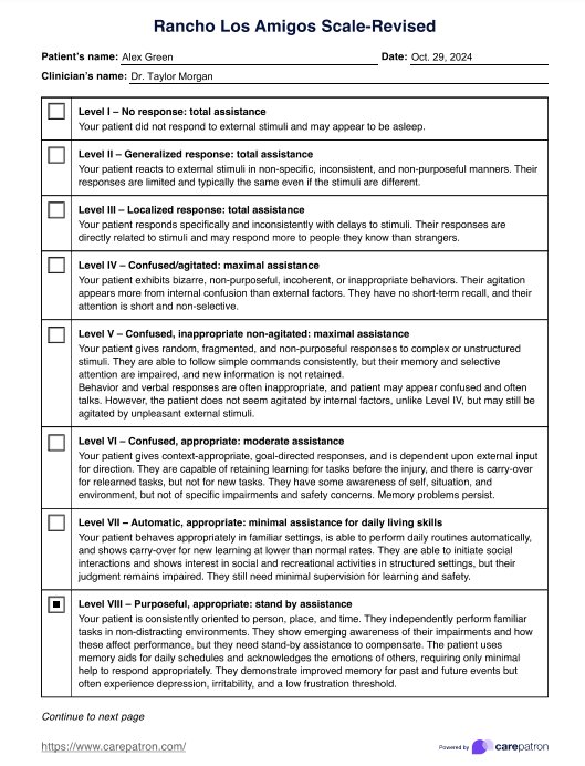 The Rancho Los Amigos Scale assesses cognitive and behavioral functioning in brain injury patients recovering from traumatic brain injury (TBI) or other head injuries. It helps healthcare professionals monitor recovery, develop care plans, and guide interventions based on the patient’s cognitive level.