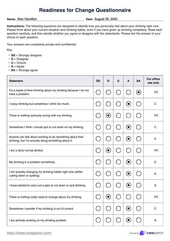 The Stages of Change Questionnaire assesses an individual’s current stage in the behavior change process, from precontemplation to maintenance. It helps healthcare providers tailor interventions to the patient’s specific stage, enhancing the effectiveness of treatment plans.