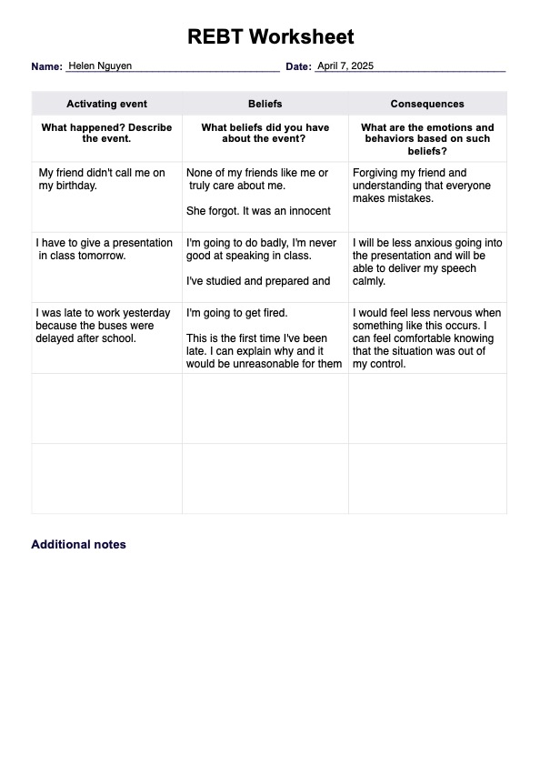 An REBT Worksheet is a resource that therapists specializing in REBT treatments use with their clients. Typically, these worksheets are distributed to clients to complete on their own. This helps to ensure that the answers genuinely reflect the client's experiences and can then be used to develop an effective treatment plan. REBT Worksheets vary in their content, and some may focus on the ABC model while others could be related to problem-solving or developing coping mechanisms.