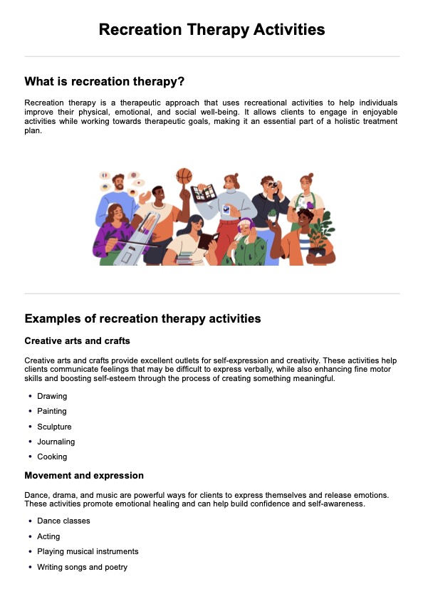 Use our Recreation Therapy Activities handout and boost clients' well-being with activity ideas tailored to their needs! Download this for free.