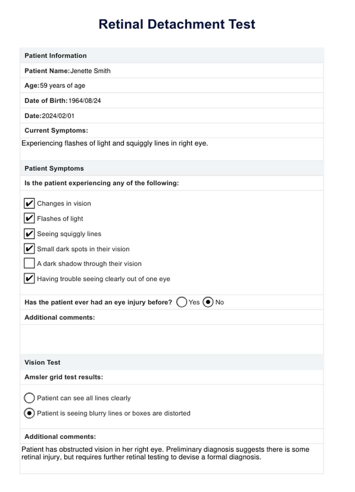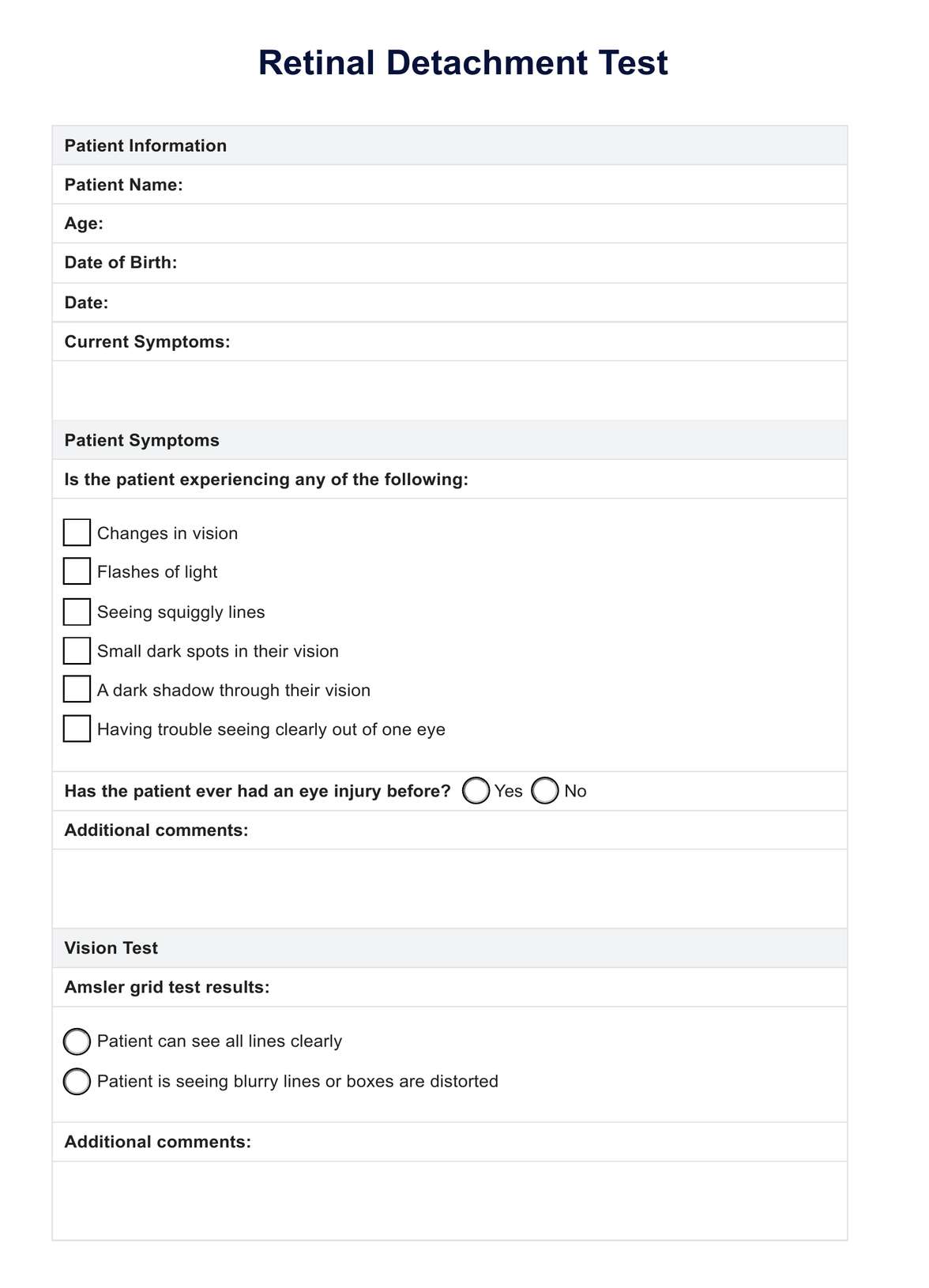 A Retinal Detachment Test is an eye examination procedure used to identify whether there is damage at the site of the retina, specifically if the retina has become detached from the blood vessels.