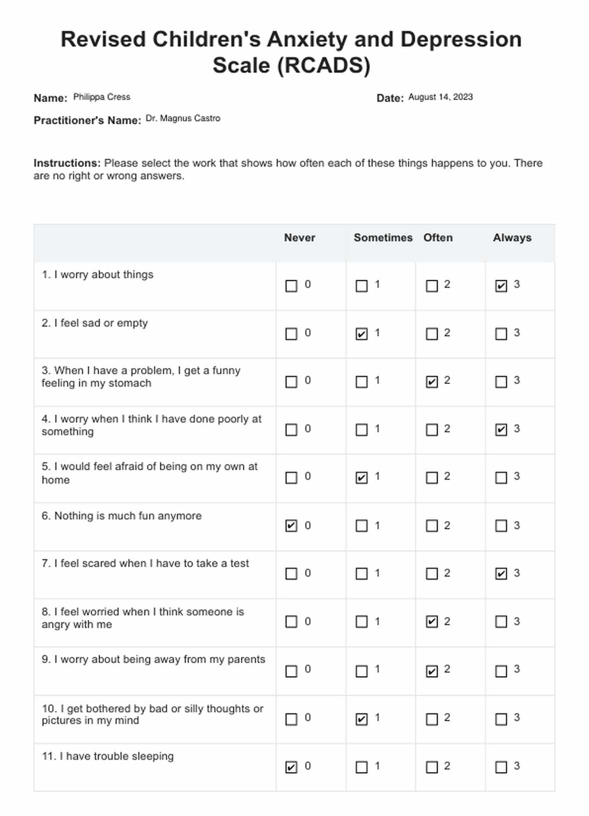 Revised Children's Anxiety and Depression Scale (RCADS) Template