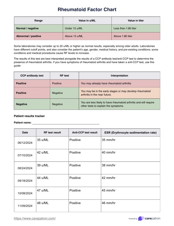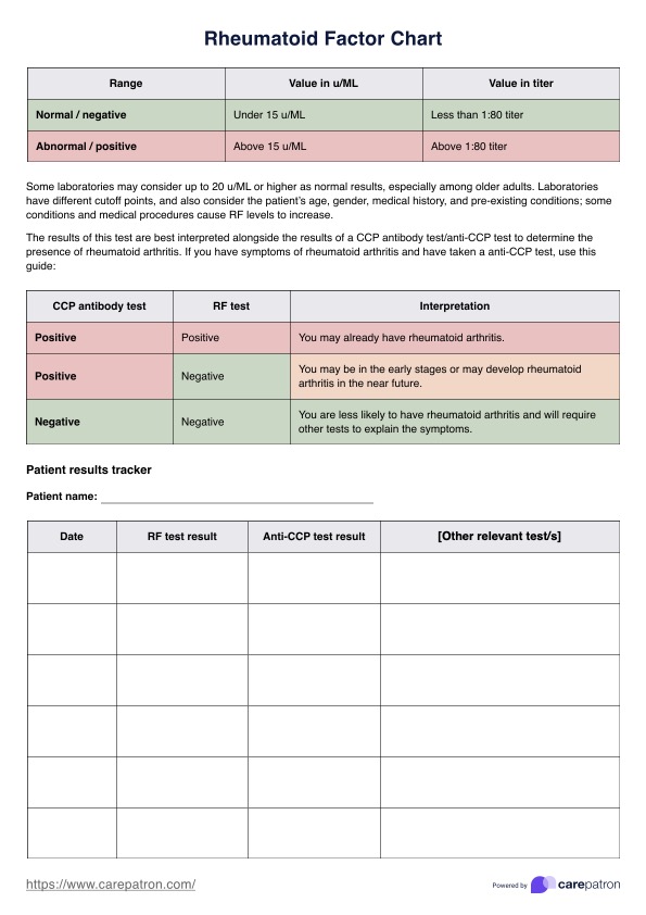 Use our Rheumatoid Factor Chart for teaching patients to easily understand RF blood test results and documenting RF levels over time.