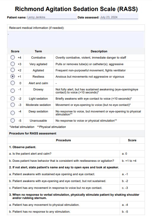 The RASS Scale has clear instructions and is easy to accomplish. It shouldn't take you more than ten seconds to assign a score, especially if you have gotten all the information you need based on your observations.