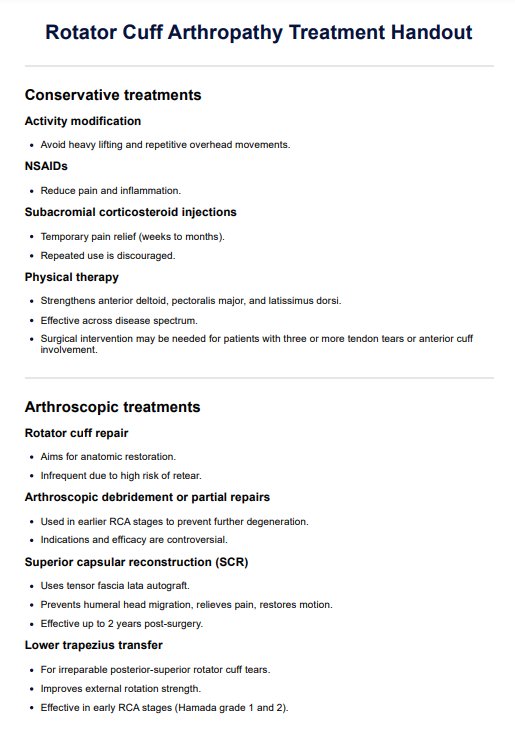 Discover treatment guidelines for rotator cuff arthropathy in Carepatron's free PDF download. Learn more about effectively managing this condition.