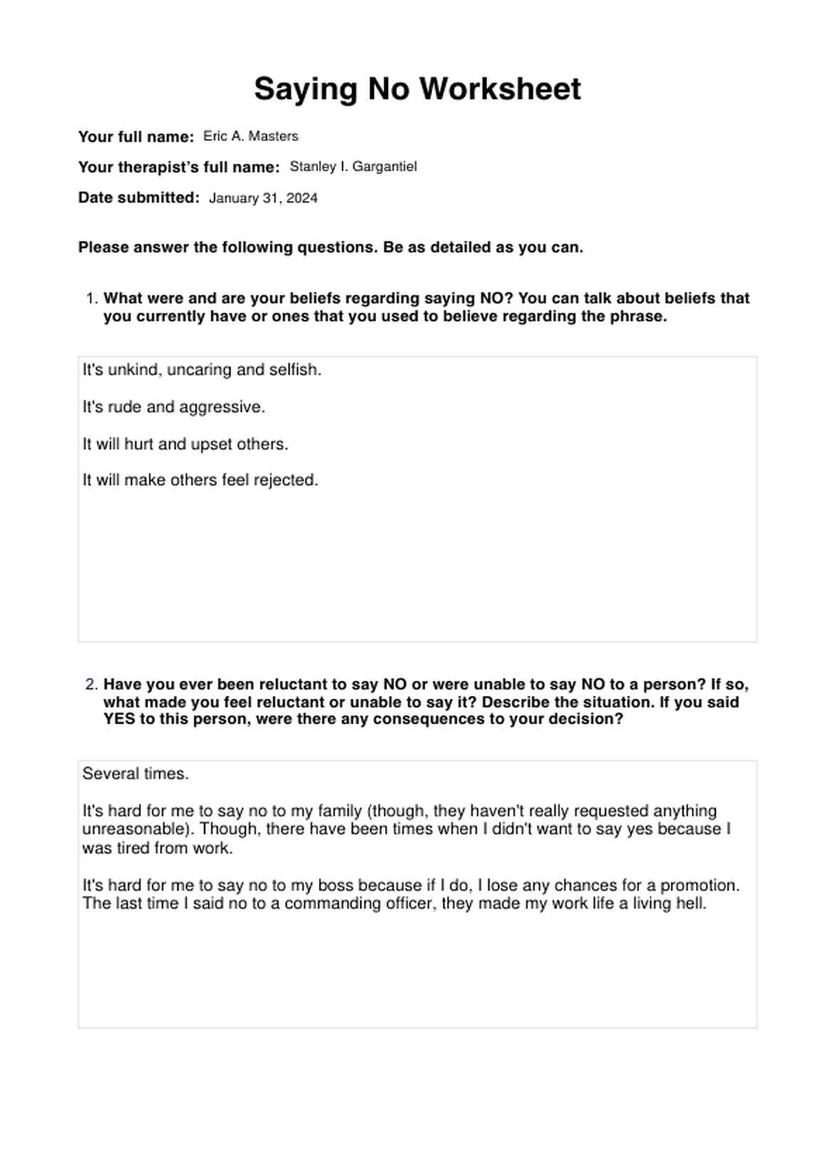 Teach your DBT patient to set boundaries and steel themselves from peer pressure and have them apply their learnings with our Saying No Worksheet PDF.