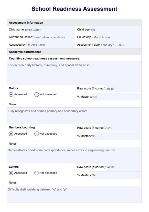 School Readiness Assessments are used to determine if a child has the cognitive, emotional, motor and social skills necessary to begin formal education. By identifying developmental needs early, these assessments lay the groundwork for a successful transition to primary education.