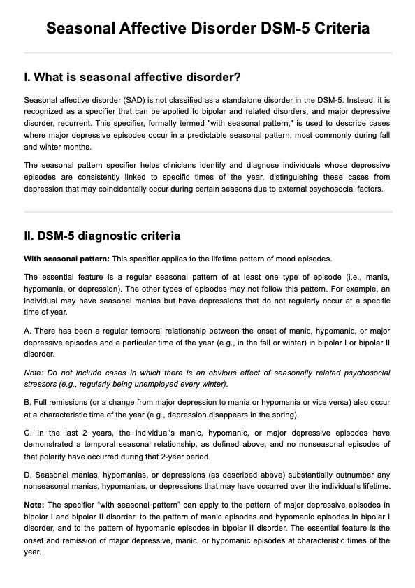 Understand the DSM-5 criteria for Seasonal Affective Disorder (SAD) with our comprehensive template, helping you accurately diagnose SAD.