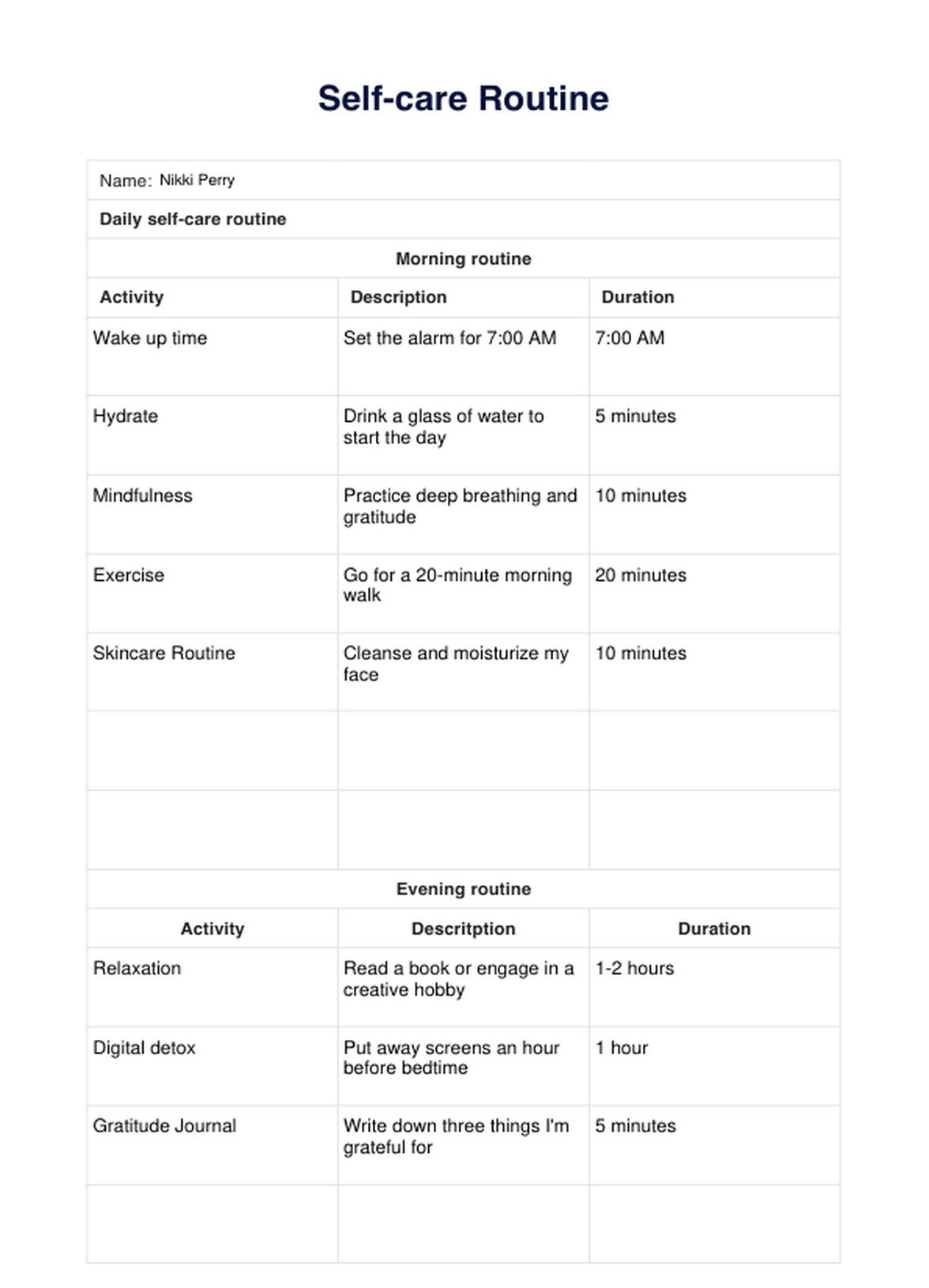 Download our free Self Care Routine Template to help your clients manage their mental health and well-being. Access the PDF template and example here.