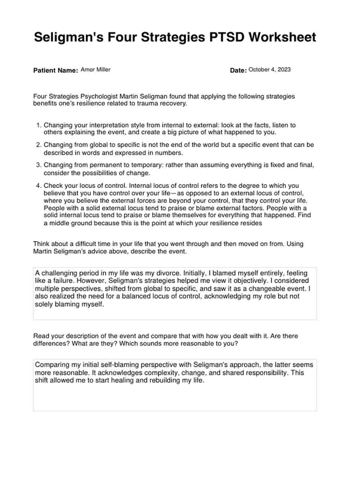 Explore Seligman's Four Strategies PTSD Worksheet and find an illustrative example. Learn how to apply these strategies for trauma recovery!
