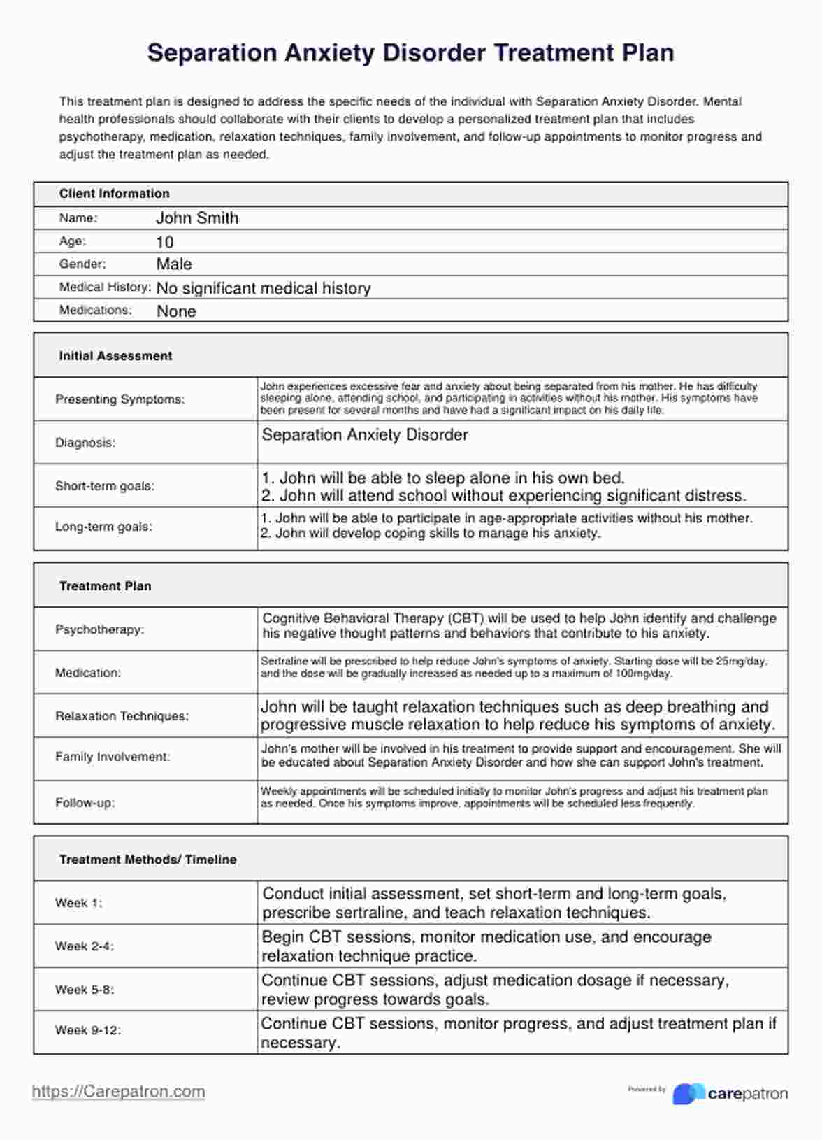 Separation Anxiety Disorder Treatment Plan Template