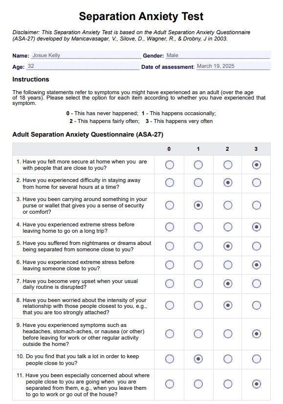 Use Carepatron's free Separation Anxiety Test PDF to effectively assess separation anxiety symptoms and behaviors in patients.