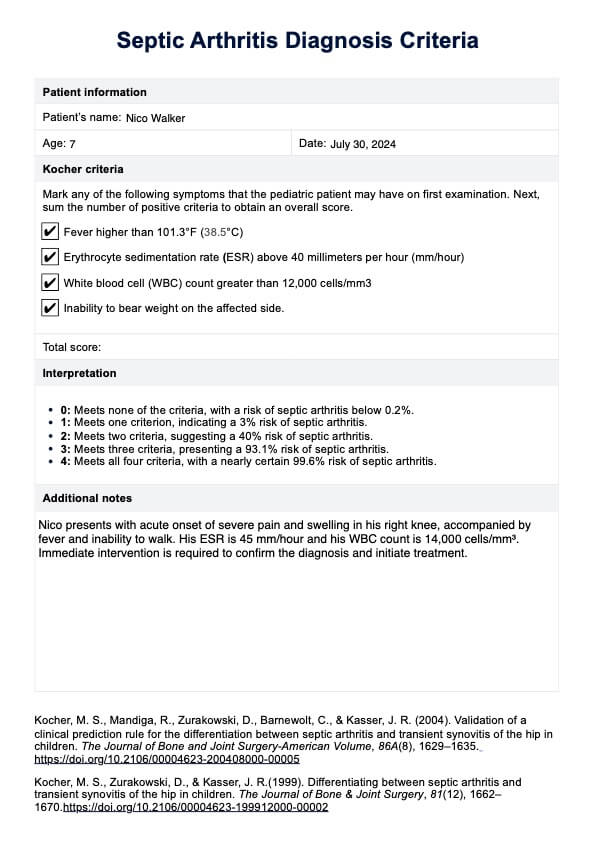 Learn about the diagnosis criteria for septic arthritis in children. Download Carepatron's free PDF for comprehensive information.