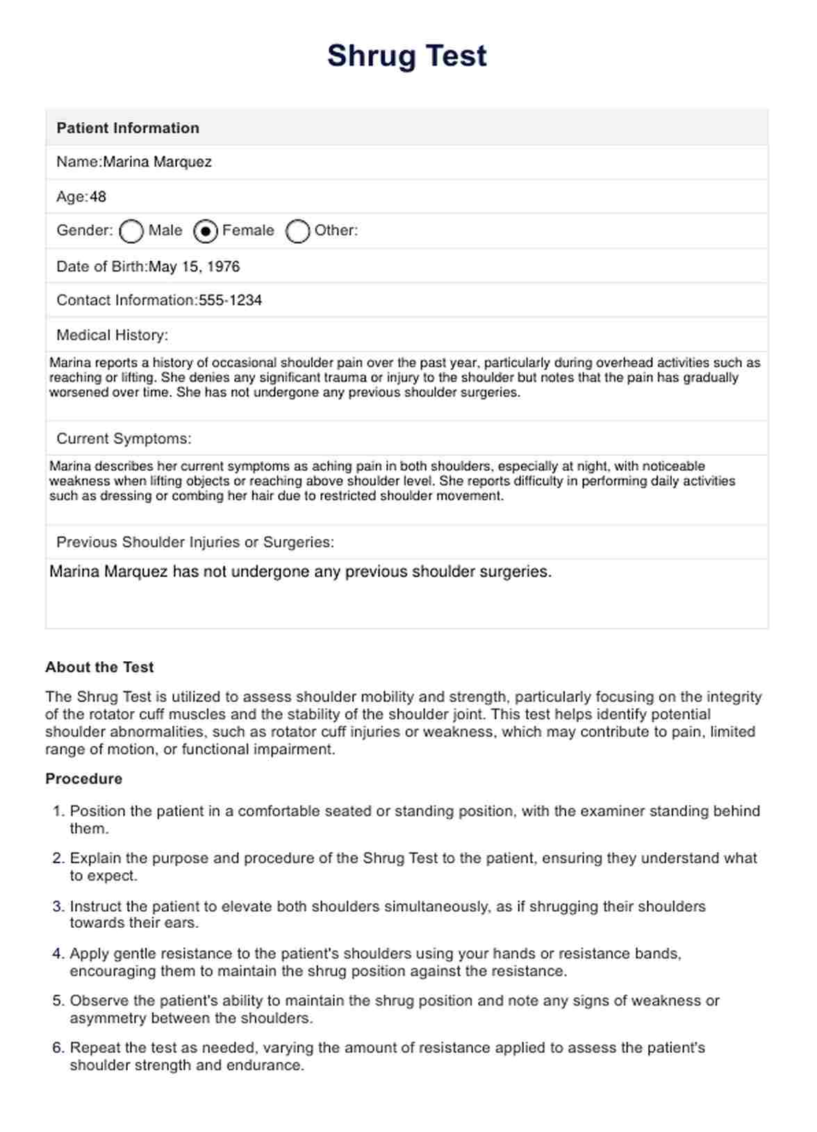 Evaluate shoulder mobility effectively with the Shrug Test. Assess range of motion for comprehensive healthcare diagnostics.