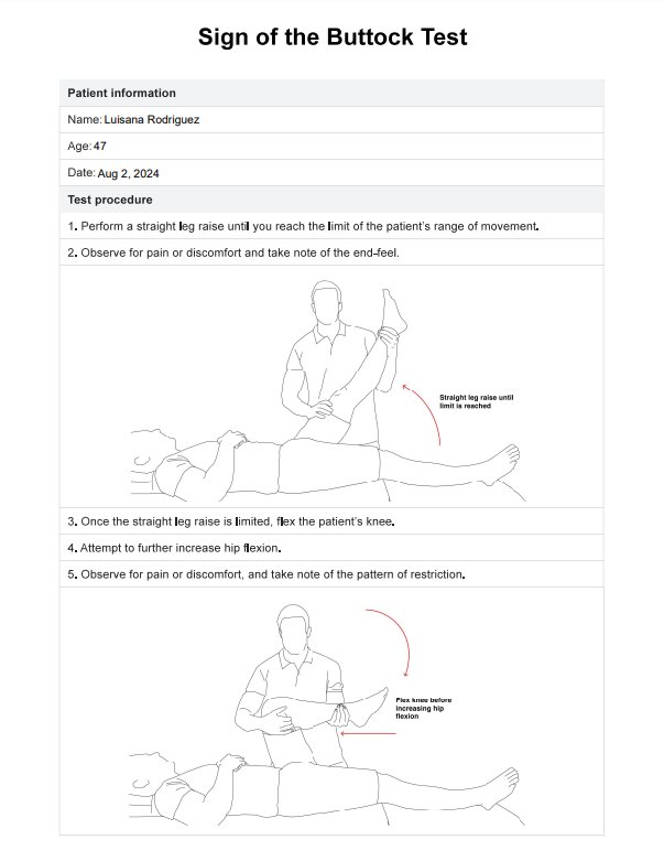 Learn about the Sign of the Buttock Test, a diagnostic tool for identifying serious underlying buttock pathologies. Use our template for consistent, efficient testing.