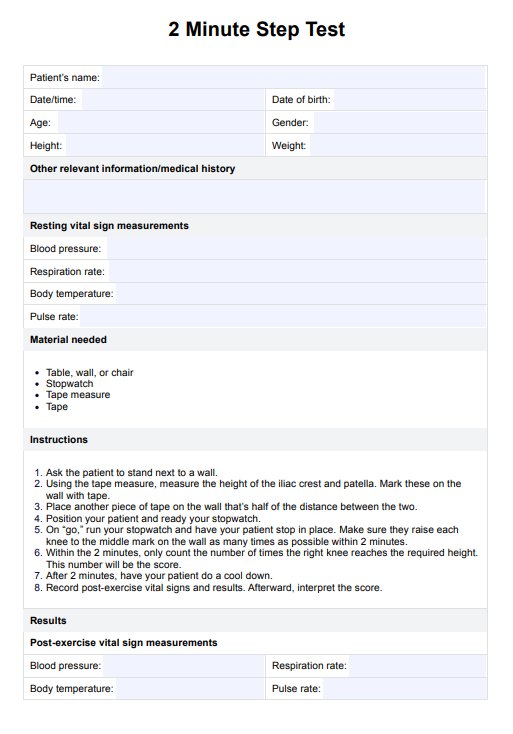 Use our Six-Minute Walk Test template to accurately assess your patient's fitness and exercise capacity with ATS- and ANPT-recommended guidelines and values.