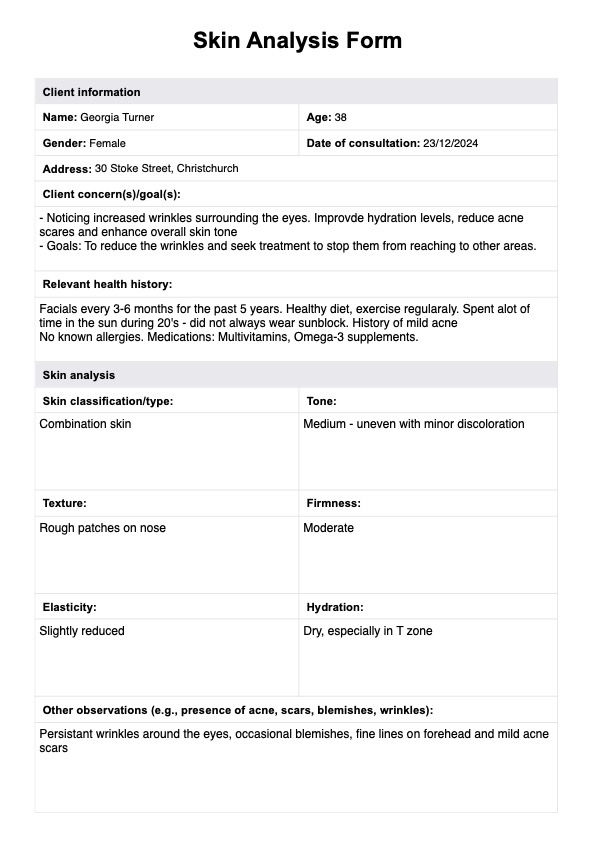 Streamline client assessments with our Skin Analysis Form. Analyze and record information to provide personalized dermatology care. Download now!